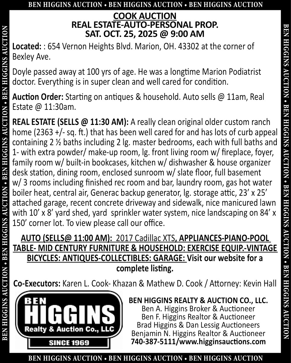 Oct 04, 2025. Ben Higgins Realty & Auction Co., LLC Auction Ads from The Delaware Gazette