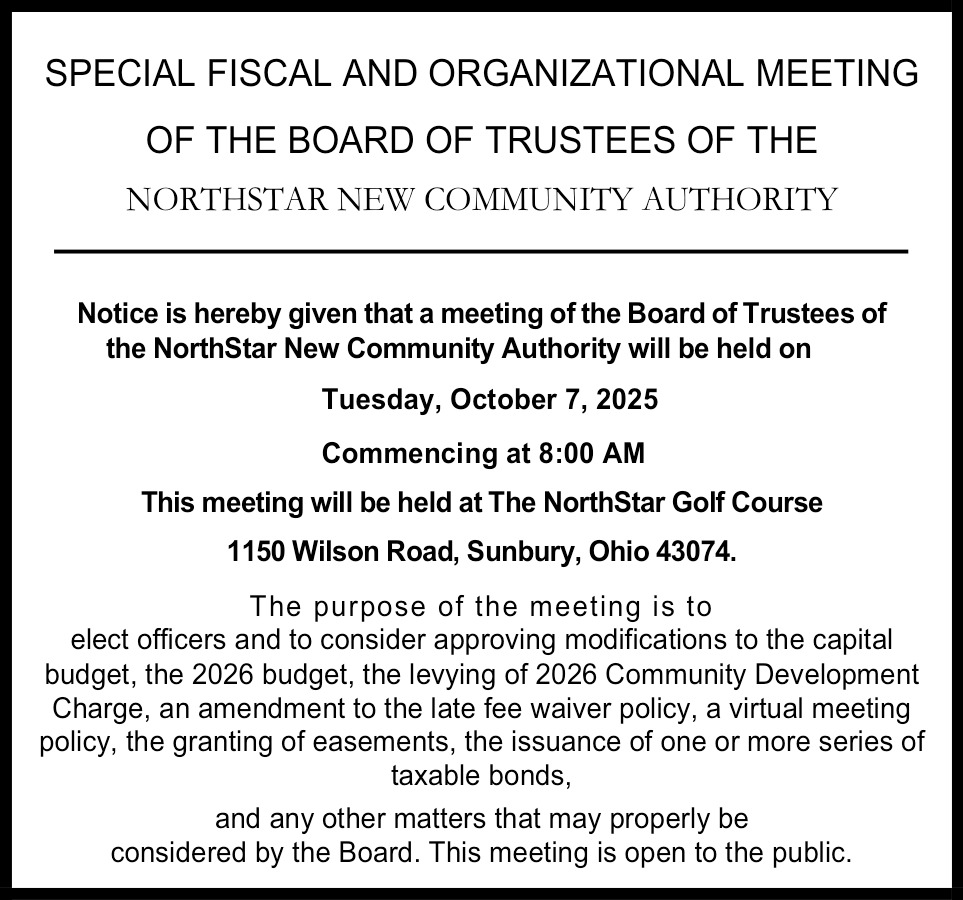 Ads for NorthStar New Community Authority Special Fiscal and Organizational Meeting (October 7, 2025) in Delaware, OH